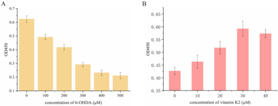 First, the effect of 6-OHDA on SH-SY5Y cell viability was detected by using the CCK-8 method. Then the cells were treated with 6-OHDA (0–500 µM) for 2 h in a dose-dependent manner. Compared with the control group, the number of viable cells was significantly reduced and the lethality of cells reached 50% at a concentration of 300 µM. Therefore, the cells treated with 6-OHDA at this concentration were selected for subsequent experiments. Subsequently, the damaged cells recovered to a certain extent after treatment with vitamin K2 (0–40 µM) for 6 h, indicating that vitamin K2 inhibited the toxic effect of 6-OHDA, and that the inhibitory effect was the best at a concentration of 30 µM. Therefore, the concentration of vitamin K2 used in subsequent experiments was 30 µM, as shown in Figure 1.