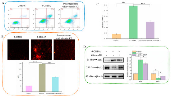 The anti-apoptotic effect of vitamin K2 on SH-SY5Y cells was investigated by using PI staining. As shown in Figure 2A, when 6-OHDA was treated, the apoptosis rate increased from 4.28% in the control group to 20.44%. However, after vitamin K2 post-treatment, the apoptosis rate was significantly reduced to 11.44%. In addition, the fluorescence microscopy results showed that the intracellular PI fluorescence signal was significantly increased after 6-OHDA treatment, indicating an increase in apoptotic cells. However, post-treatment with vitamin K2 reduced the PI fluorescence signal. (Figure 2B). In addition, through the study of vitamin K2 on the expression of apoptosis signaling proteins Bax and Bcl-2 in SH-SY5Y cells, it was found that vitamin K2 could significantly inhibit the ratio of mRNA and protein expression level on pro-apoptotic protein (Bax) and anti-apoptotic protein (Bcl-2) (Figure 2C,D). These results indicate that vitamin K2 could inhibit apoptosis induced by 6-OHDA and alleviate cell damage.