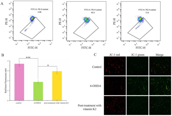 A hallmark event in the early stages of apoptosis is a decrease in the mitochondrial membrane potential. The JC-1 probe can detect the mitochondrial membrane potential. When JC-1 forms aggregates that can produce red fluorescence, it means that the mitochondrial membrane potential is high; but when it forms a monomer that can produce green fluorescence, it means that the mitochondrial membrane potential is low. Therefore, the change in cell membrane potential can be easily detected by the transition of red and green fluorescence. When the cells were exposed to 6-OHDA, a significant enhancement in the green fluorescence signal was observed, while the red/green ratio decreased compared to the control group. However, after post-treatment with vitamin K2 for 6 h, the green fluorescence signal decreased, and the red/green ratio increased (Figure 4). This shows that vitamin K2 can restore the mitochondrial membrane potential and inhibit mitochondrial depolarization caused by 6-OHDA.