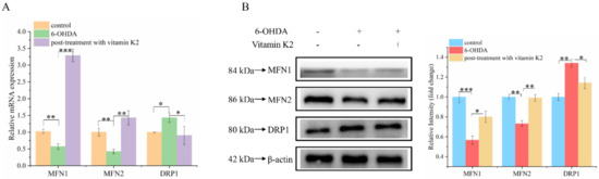 Mitochondria are dynamic organelles. Mitochondrial fission and fusion together constitute mitochondrial dynamics. These two opposing processes work together to maintain the shape, size, number, and physiological function of the mitochondria [22]. We analyzed the changes of mitochondrial fusion and fission-related proteins by using Western blot and RT-qPCR to explore the effect of vitamin K2 on mitochondrial fusion and fission. Compared with the control group, the mRNA (Figure 5A) and protein (Figure 5B) expression levels of mitochondrial fission-related proteins (MFN1 and MFN2) in the 6-OHDA treatment group decreased, while the expression level of mitochondrial mitogen-related proteins (DRP1) increased. For the post-treatment with vitamin K2, the expression levels of MFN1 and MFN2 were increased, and the expression level of DRP1 was significantly decreased. However, the expression of DRP1 was increased compared with the normal group (Figure 5A,B). These results indicated that vitamin K2 treatment inhibited the abnormal mitochondrial division and fusion caused by 6-OHDA and promoted normal mitochondrial division, thus accelerating the clearance of damaged mitochondria. It has been demonstrated that vitamin K2 is able to maintain the homeostasis of the mitochondrial network, improve mitochondrial dysfunction, and prevent the expansion of mitochondrial damage.
