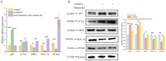 Mitophagy is a process that specifically targets and degrades damaged mitochondria. The timely removal of damaged mitochondria can effectively block cell death caused by damaged mitochondria [23]. Among them, the degradation products of amino acids, fatty acids, and other small-molecule compounds can be recycled by the body to provide a material basis for mitochondrial biogenesis. Western blotting and RT-qPCR were used to analyze changes in mitophagy and mitochondrial biogenesis-related proteins in each group. Compared with the control group, the expression levels of mitophagy-related proteins p62 and LC3A in the 6-OHDA-treated group increased, whereas the expression levels of PGC-1α, NRF1, and TFAM were decreased, and they are associated with mitochondrial biogenesis. In addition, post-treatment with vitamin K2 decreased the expression of mitophagy-related protein p62; increased the expression of LC3A; and increased the expression of PGC-1α, NRF1, and TFAM (Figure 6). This indicates that vitamin K2 promoted mitophagy and mitochondrial biogenesis in 6-OHDA-injured cells. These results suggest that vitamin K2 improves mitochondrial dysfunction and alleviates cell damage by regulating the mitochondrial quality-control system.