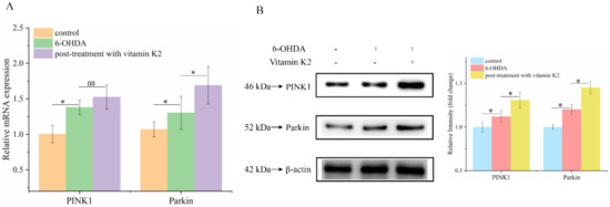 Attenuated mitophagy due to the silencing of PINK1 and Parkin proteins is a common trigger in PD [24]. To explore whether the PINK1/Parkin signaling pathway is involved in the mitophagy process regulated by vitamin K2, RT-qPCR and Western blotting were used to analyze the mRNA (Figure 7A) and protein (Figure 7B) expression levels of PINK1 and Parkin, respectively. The results showed that 6-OHDA slightly increased the expression of PINK1 and Parkin proteins, compared to that in the control group. Compared to the 6-OHDA treatment group, the expression levels of PINK1 and Parkin in the group treated with vitamin K2 increased. These results suggest that the PINK1/Parkin signaling pathway participates in the activation of mitophagy induced by vitamin K2.