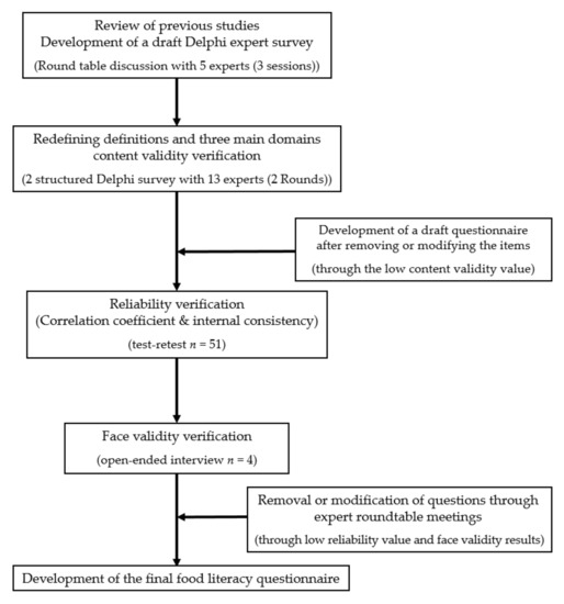 Figure 1 outlines the process for redefining the concept and the main domains of food literacy and developing a measurement tool. First, definitions for the main domains of food literacy were determined by reviewing previous studies and expert workshops, which led to the development of a draft Delphi expert survey. Next, the definition and three main domains of food literacy were redefined by conducting the Delphi survey of experts, and the content validity of the questionnaire was verified. Based on the results of the Delphi survey, a reliability test was conducted by analyzing the correlation coefficient through the test–retest method and internal consistency through Cronbach’s alpha for general adults after developing the draft questionnaire. Next, one-on-one interviews were conducted with general adults to verify face validity and the understanding of the questionnaire items. The final questionnaire on food literacy based on the reliability and validity results was then completed during an expert roundtable meeting. All the participants provided written consents, and the study protocol was approved by the Institutional Review Board of Hallym University (HIRB-2021-009).