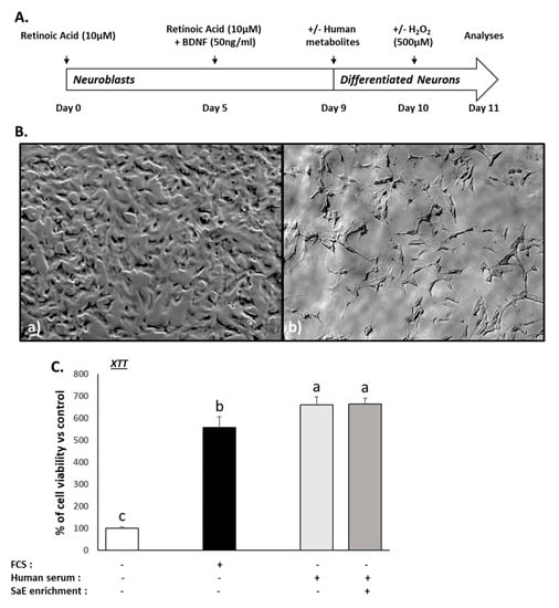 SH-SY5Y cells’ differentiation into mature neurons and impact of human serum enriched with SaE, or not, on cellular viability. The differentiation protocol using retinoic acid and BDNF (A) led to progressive morphological changes, including neurite growth (B(b)), compared to undifferentiated cells (B(a)). Compared to FCS, cellular viability was slightly increased in SH-SY5Y cells exposed to human serum for 48 h, as measured with an XTT-based assay (C). Measures were performed in quadruplicates per condition/volunteer (n = 8 volunteers). Groups significantly different from each other (p < 0.05) are indicated with different letters. Groups with no significant statistical difference from each other share the same letter. XTT: global ANOVA p-value < 0.001 and F-value: 210.351.