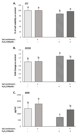 Effect of human serum enriched with SaE metabolites on the cellular injuries caused by H2O2-induced oxidative stress in SH-SY5Y cells. On day 9, differentiated SH-SY5Y cells were incubated with human serum for 24 h prior to an additional 24 h of treatment with 500 µM H2O2. Proliferation was measured using an XTT-based assay (A). Intracellular ROS levels (B), as well as BDNF production (C), were measured using DCFDA- and ELISA-based assays, respectively. SaE enrichment was able to significantly counteract the decreased viability (A) and BDNF production (C), as well as the increase in intracellular ROS (B) caused by H2O2 treatment. Measurements were performed in quadruplicates for each sample of the eight volunteers. Groups significantly different from each other (p < 0.05) are indicated with different letters. Groups with no significant statistical difference from each other share the same letter. XTT: global ANOVA p-value < 0.001 and F-value: 6.592. DCFDA: global ANOVA p-value < 0.001 and F-value: 9.536. BDNF: global ANOVA p-value < 0.001 and F-value: 27.722.