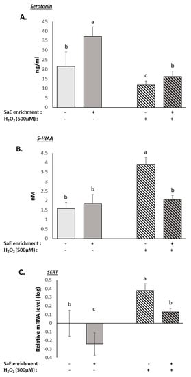 Effect of human serum enriched with SaE metabolites on the serotonin pathway dysregulations caused by H2O2-induced oxidative stress in SH-SY5Y cells. Differentiated SH-SY5Y cells were incubated with human serum for 24 h prior to an additional 24 h of treatment with 500 µM H2O2. Serotonin (A) and 5-HIAA (B) production was measured using ELISA-based assays. SERT mRNA expression was analysed by RT-qPCR and expressed in log10 scale relative to the control SaE(−)/H2O2(−) (C). H2O2 inhibited serotonin release (A) and increased both 5HIAA (B) production and SERT mRNA expression (C). SaE enrichment led to a restoration of serotonin pathway homeostasis. Measurements were performed in quadruplicates for each sample of the eight volunteers. Groups significantly different from each other (p < 0.05) are indicated with different letters. Groups with no significant statistical difference from each other share the same letter. Serotonin: global ANOVA p-value < 0.001 and F-value: 24.683. 5-HIAA: global ANOVA p-value < 0.001 and F-value: 38.620. SERT: global ANOVA p-value < 0.001 and F-value: 29.500.