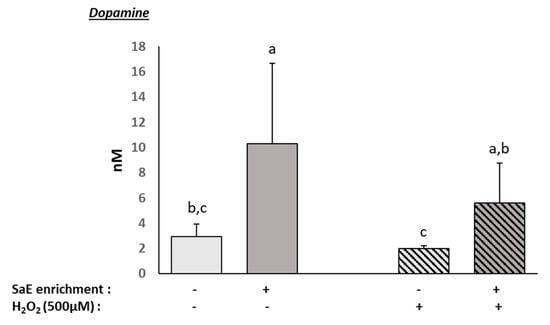 Effect of human serum enriched with SaE metabolites on the dopamine release by SH-SY5Y cells in oxidative stress conditions. Differentiated SH-SY5Y cells were incubated with calf serum or human serum for 24 h prior to an additional 24 h of treatment with 500 µM H2O2. Extracellular dopamine was measured using an ELISA-based assay. H2O2 induced a reduction in dopamine release, which was counteracted by the presence of SaE-enriched serum. Measurements were performed in quadruplicates for each sample of the eight volunteers. Groups significantly different from each other (p < 0.05) are indicated with different letters. Groups with no significant statistical difference from each other share the same letter. Dopamine: global ANOVA p-value = 0.010 and F-value: 4.043.
