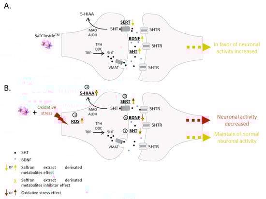 Schematic representation of saffron extract effects, oxidative stress effects, and potential protective effects of saffron extract on neurons. (A): In the absence of oxidative stress conditions, saffron extract metabolites promote serotonin and BDNF release, as well as the down-regulation of serotonin reuptake transporter (SERT) expression. (B): Oxidative stress is known to induce intracellular reactive oxygen species (ROS) production (1). In serotoninergic neurons, oxidative stress is associated with lower serotonin release (2) and higher (SERT) expression (3). Consistent with this SERT up-regulation, serotonin catabolism is enhanced and levels of 5-Hydroxyindoleacetic acid (5HIAA) metabolite rise (4). Together, these altered serotonin parameters support decreased serotonergic neurotransmission. In addition, brain-derived neurotrophic factor (BDNF) production is impaired under oxidative stress conditions (5). Promotion of serotonin release in absence of oxidative stress conditions contributes to the prevention of oxidative-stress-related alterations in the serotonin system and the preservation of normal serotonergic neurotransmission under stress. Saffron extract metabolites inhibit both ROS production and oxidative-stress-related BDNF decrease, thereby participating in the preservation of neuron activity as well. TRP: Tryptophan. TPH: Tryptophane hydroxylase. DDC: 5-hydroxytryptophan decarboxylase. 5HT: Serotonin. MAO: Monoamine oxidase. ALDH: Aldehyde dehydrogenase. 5HTR: Serotonin receptor.