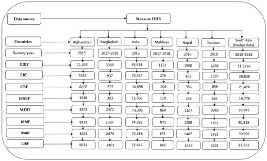 This study analyzed the most recent nationally representative data of six SACs—Afghanistan (2015), Bangladesh (2017–2018), India (2016), Maldives (2017), Nepal (2016), and Pakistan (2018). Though Bhutan and Sri Lanka are on the list of SACs, we excluded these two countries because in Bhutan the DHS program is not functioning, and the latest Sri Lankan DHS data are restricted. The DHS follows a similar methodology to collect cross-sectional data by applying a multistage cluster sampling technique. The use of the unique methodology of the DHS allows the cross-country comparison of estimates. The DHS compiles information on a variety of health-related indicators and their sociodemographic factors, including the socioeconomic status of the household, women’s empowerment, and healthcare-seeking behaviors. The interviews are conducted only where the respondent gives voluntary informed consent. The DHS data are publicly available from the DHS program website (https://dhsprogram.com/, accessed on 3 April 2020) [31].