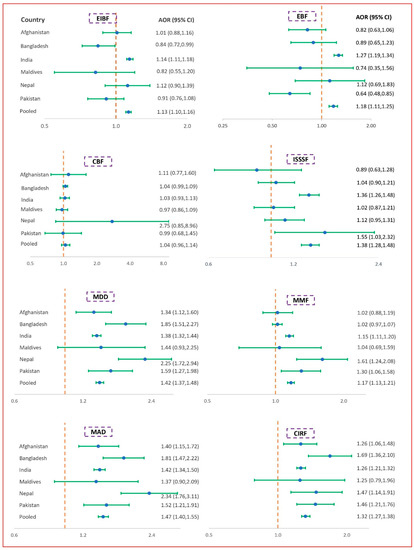 In SACs, overall, about 45% of mothers practiced EIBF, whereas the prevalence of EBF and CBF were 54% and 83%, respectively. In the case of complementary feeding, overall, the ISSSF, MDD, MMF, MAD, and CIRF practices were 50%, 22%, 40%, 13%, and 21%, respectively. The lowest prevalence of EIBF was noticed in Pakistan (21%), of EBF in Afghanistan (42%), and of MAD in India (13%) (Table S2).