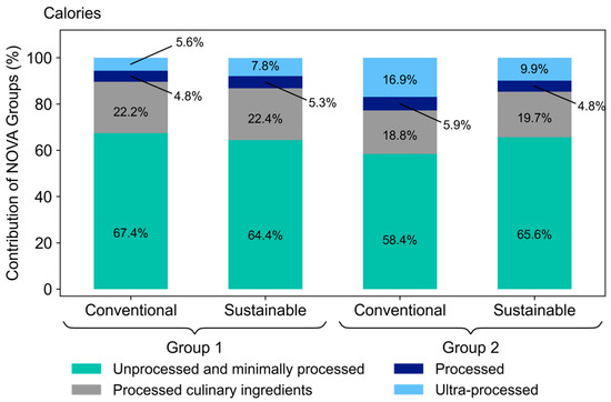 The sustainable food menu, planned for students of Group 1, presented a lower amount of calories from unprocessed foods and higher caloric share of processed and ultra-processed foods, when compared to the conventional one, as shown in Figure 1. On the other hand, in the food menus planned for Group 2, the situation is reversed; the sustainable had a higher caloric share of unprocessed foods, as well as a lower share of processed and ultra-processed foods. It is important to remark that, in all menus, for all groups, the unprocessed foods account for over 58% of the calories.