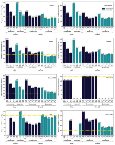 Macronutrient adequacy of conventional and sustainable menus to nutritional targets, according to the age group. Age groups considered were from 7 months to 60 years old, for both school food menus. Yellow dashed line represents the national daily nutritional recommendation for school meals (Group 1 is 70%, and Group 2 is 30% of the daily intake). For saturated fat, cholesterol, and added sugar, the daily nutritional recommendation refers to a maximum level. N/A means no official recommendations for this age group. Mths and yrs on the X axis mean months and years, respectively.