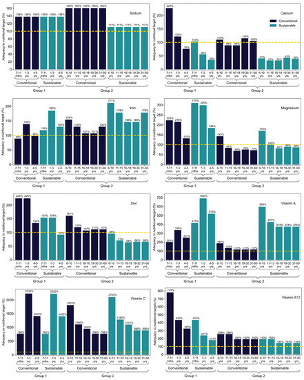 Micronutrients adequacy of conventional and sustainable menus to nutritional targets, according to the age group. Age groups considered were from 7 months to 60 years old, for both school food menus. Yellow dashed line represents the national daily nutritional recommendation for school meals (Group 1 is 70%, and Group 2 is 30% of the daily intake). For sodium, the daily nutritional recommendation refers to a maximum level. N/A means no official recommendations for this age group. Mths and yrs on the X axis mean months and years, respectively.