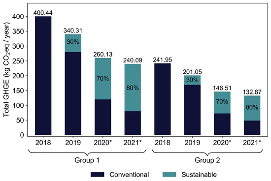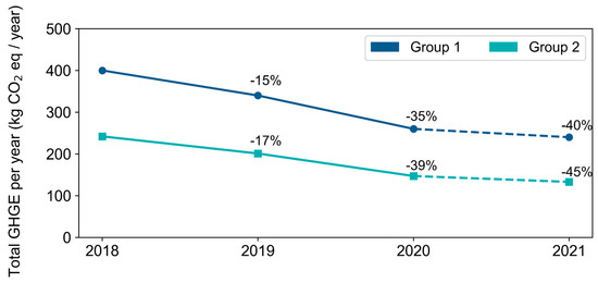 The percentage decrease in the total GHGE produced per year, based on the implementation of more sustainable food menus, rather than conventional menus, is shown in Figure 6. By analysing these results, it was found that, the higher the use of the sustainable menus, the lower the greenhouse gas emission, for both school age groups. Moreover, starting from a 100% conventional menu in 2018 and moving to two days a week in 2019 reduced GHGE by 15% for school Group 1 and 17% for school Group 2. By increasing the ratio of the use of sustainable to conventional menus further, a reduction of 40% and 45% was to be expected in 2021, according to the school age group, due to the adoption of sustainable menus four days a week.
