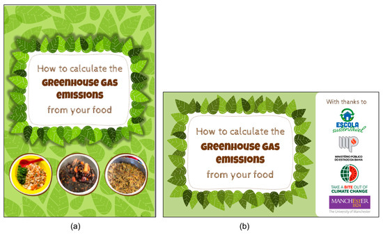 As a part of disseminating information, and to positively engage with the school community, educational resources that focused on food sustainability and the calculation of GHGE were created. Datasets containing the environmental impacts of a diverse range of foods were carefully evaluated to extract their GHGE values and input them into an instructive booklet (Figure 7a).