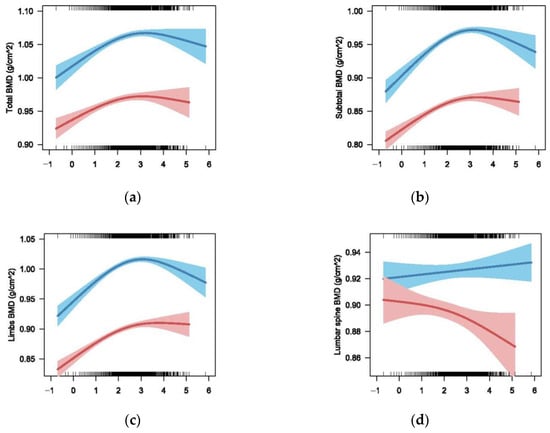 3.2.3. The Association between BLLs and BMD of Different Sex