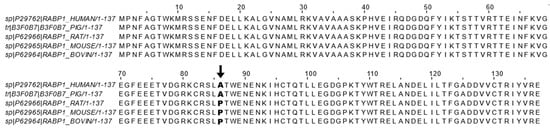 Figure 1. CRABP1 sequence alignment across mammals. Reported CRABP1 protein sequences from the Uniprot database of human (ID: P29762) [41], pig (ID: B3F0B7) [42], rat (ID: P62966) [43], mouse (ID: P62965) [44], and bovine (ID: P62964) [45] were aligned using the ClustalWS alignment algorithm in Jalview. Only the residue at position 86 (indicated by bold text and arrow ↓) is not conserved and exists either as an alanine (A) in human and pig sequences or as a proline (P) in bovine, rat, and mouse sequences.
