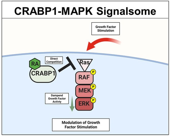 A specific Crabp1-signaling complex was first proposed after studying embryonal carcinoma (EC) and embryonic stem (ES) cells that were stimulated by a physiological concentration (10 nM) of atRA to modulate their proliferation/differentiation (reviewed in [46,47]). The initial study detected a very rapid (within minutes) response of these cells to atRA administration, which occurred in the cytosol and involved a mitogen-activated protein kinase (MAPK) pathway to modify target proteins for specific post-translational modifications [20,21,22,23]. This atRA-elicited signal was found to involve CRABP1, and could rapidly (within minutes) alter (dampen) the activity of the initiating kinase of the MAPK pathway, which is the rapidly Accelerated Fibrosarcoma (RAF) kinase and is a cell membrane-anchored kinase activated by the mitogenic signal Ras GTPase [48]. The MAPK kinase signaling cascade is comprised of Ras GTPase which activates RAF, then mitogen-activated protein kinase kinase (MEK), and then extracellular-signal-regulated kinase (ERK). Activation of this signaling pathway generally leads to cell proliferation and growth for stem/progenitor cells [48]. Through biochemical and molecular studies, it is now established that CRABP1 competes with Ras by directly interacting with RAF at its Ras-binding domain, thereby dampening MAPK signal propagation and ultimately modulating (reducing) cell proliferation of ES, EC, and neural stem cell (NSC) [22,25,29]. The proposed mechanistic model for CRABP1-MAPK signalsome is shown in Figure 2.