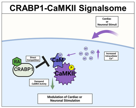 A different CRABP1-signaling complex was identified from studying deteriorated heart function of CKO mice [26,27], and their premature weakening in motor function [33]. The expression study confirmed CRABP1 expression in cardiomyocytes [26] (relevant to the CKO heart phenotype) and motor neurons (relevant to the CKO motor function phenotype) [33]. This signaling complex is comprised of CRABP1 and calcium-calmodulin-dependent kinase 2 (CaMKII), an enzyme critical to calcium signaling/handling and highly enriched in both cardiomyocytes [69] and neurons [70,71]. It is known that CaMKII regulates contraction in cardiomyocytes [69] and long-term potentiation in neurons [70,71], respectively. Both types of cells are highly dependent upon calcium homeostasis for their functions where CaMKII is a key mediator of calcium signaling [72]. All the CaMKII isoforms have a conserved architecture comprised of the kinase, regulatory, and association/oligomerization domains, and share the same activation mechanism through the binding of calmodulin to the calmodulin-binding domain (CaMBD) within its regulatory domain. CaMKII activation occurs when intracellular (Ca2+) increases and binds calmodulin. Ca2+-calmodulin then binds and activates CaMKII, which is often marked by phosphorylation at threonine 286/7 (T286/7), depending on the CaMKII isoform [73,74]. In vitro data showed that CRABP1competes with calmodulin by directly interacting with CaMKII at the CaMBD [26,27]. Therefore, CRABP1 could dampen Ca2+/Calmodulin activated CaMKII activity. Since over-activation of CaMKII is a major trigger of the death/damage of cardiomyocytes [75] and neurons [76], by dampening CaMKII over-activation, CRABP1 can play a protective role in maintaining the health of both the heart and neurons. These are elaborated on in the following section. The proposed mechanistic model for CRABP1-CaMKII signalsome is shown in Figure 3.