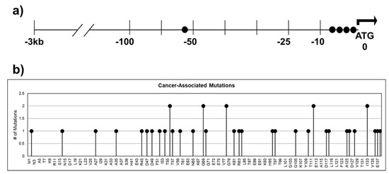 Figure 4. SNPs identified in cancer patients within the 3 kb upstream regulatory region and the coding sequence of CRABP1. (a) Gene diagram of the 3 kb upstream region of CRABP1 with SNPs denoted by “●”. (b) Lollipop plot indicating the location of amino acid mutations as a consequence of cancer-associated SNPs.