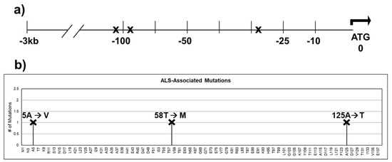 Figure 5. SNPs identified within the 3 kb upstream regulatory region and the coding sequence of CRABP1 in ALS patients. (a) Gene diagram of the 3 kb upstream region of CRABP1 with SNPs denoted by “X”. (b) Lollipop plot indicating the location of amino acid mutations as a consequence of ALS-associated SNPs. Altered residues are marked above each lollipop.