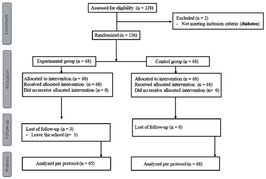 Of the 138 children who were screened for eligibility from the two selected schools, two did not meet the inclusion criteria and were excluded. The remaining 136 participants were randomly assigned to the experimental and control groups (n = 68 in each group). Finally, 133 participants completed the study, excluding 3 who did not complete the entire follow-up process and who were missing weight and height data for some of the measurements: 65 in the experimental group and 68 in the control group (Figure 1).