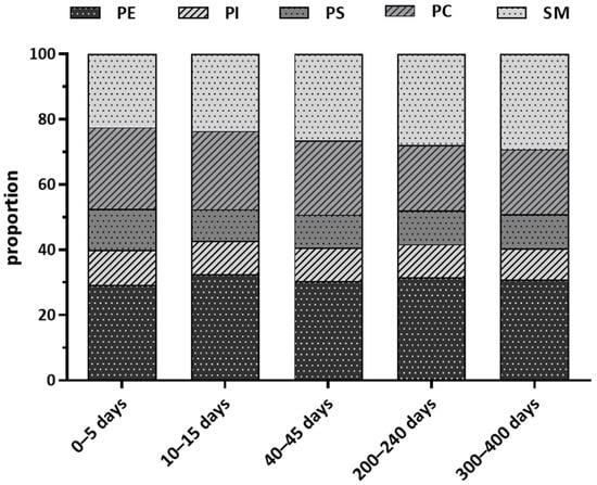Furthermore, we described the proportion of components in TPL at different lactation stages in Figure 2. PE was the most abundant PLs constituent in human milk (ranging from 29.18% to 32.52%) across lactation. In comparison, PI and PS together accounted for around 20% (PI: ranged from 9.61% to 10.65%; PS: ranged from 9.65% to 12.73%). Moreover, PC constituted larger proportion in colostrum (25.04%) and transition milk (23.98%) than SM (colostrum: 22.39%; transition milk: 23.64%), but results were reversed in later lactation periods (PC vs. SM in mature milk of 40–45 days: 22.66% vs. 26.55%; 200–240 days: 19.97% vs. 27.97%; 300–400 days: 19.90% vs. 29.17%).