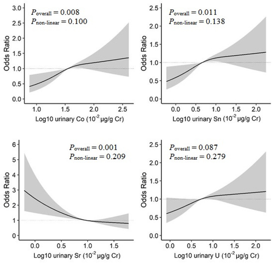 In the BKMR model, increased urinary Co, Sn, and U concentrations and decreased urinary Sr concentrations were linearly associated with increased prevalence of T2D (Figure S4). When examined by restricted cubic spline analysis with 3-knot, a positive linear dose–response relationship was observed for Co (Poverall = 0.008, Pnon-linear = 0.100), and Sn (Poverall = 0.011, Pnon-linear = 0.138), as well as an inverse linear relationship for Sr (Poverall = 0.001, Pnon-linear = 0.209) (Figure 3).