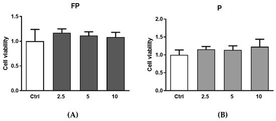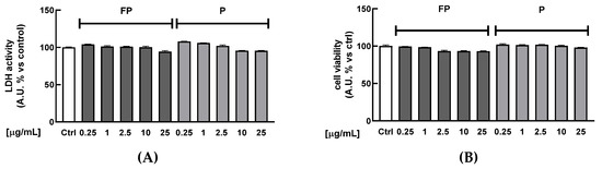 Treatments of RAW 264.7 with FP and P for 24 h at different concentrations (range 2.5–10 µg/mL) were not toxic (Figure 6). Therefore, based on these experiments, we selected 10 µg/mL concentration for subsequent experiments.