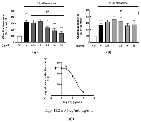 A chemiluminescent (CL) cell-based bioassay was utilized to evaluate the intracellular antioxidant activity of FP or P solutions in HUVECs [38]. Briefly, HUVECs were treated with berries solutions for 24 h (range 0.25–25 μg/mL); the day of the experiment cell medium was changed, and cells were exposed to the oxidant agent menadione (25 μM). As shown in Figure 2A,B, FP significantly reduces intracellular H2O2 production at 2.5, 10 and 25 μg/mL (p < 0.05, p < 0.01 and p < 0.001, respectively), while treatment with p does not have any significant effect. The IC50 of FP was evaluated by a dose–response curve, obtaining a value of 13.2 ± 0.6 μg/mL (Figure 2C).