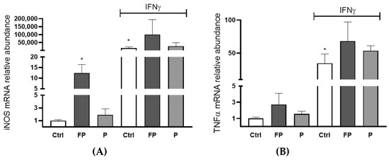 RAW 264.7 (4.0 × 105/well) were seeded in six wells and incubated with 10 μg/mL of FP or P in the presence or absence of 100 U/mL of IFN-γ for 24 h. (A) iNOS and (B) TNFα genes expression was assessed using qRT-PCR analysis. Differences in gene expression were calculated using the 2−∆∆Ct formula and RPL13A as reference gene. Results are expressed as mean ± SD of at least three experiments. * p <0.05. significantly different from the ctrl. Ctrl (control, untreated cells); FP (cells treated with fermented Pushgay); P (cells treated with Pushgay); IFN-γ (cells treated with IFNγ).