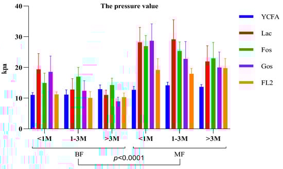 The transfer of infant feces to media containing different carbon sources (lactose, fructooligosaccharide (FOS), galactooligosaccharide (GOS), and fucosyllactose (2′-FL)) showed that gas production by infant fecal bacteria from MF sources was significantly higher than that of the control group (YCFA). In contrast, among BF infant fecal bacteria, only the in vitro fermentation of fecal bacteria at growth stages 1 and 2 produced more gas than the control, whereas gas production at growth stage 3 did not differ significantly between media. In addition, the gas production of infant fecal bacteria from MF infants was significantly (p < 0.05) higher than that produced by BF infant fecal bacteria in media with different carbon sources (Figure 2).
