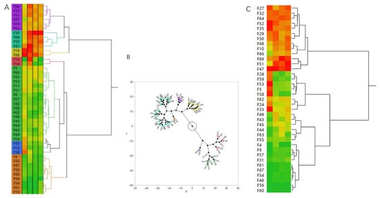 Cluster heat map analysis of fecal samples based on gas and ammonia production (A): the cluster (A) and constellation (B) diagram of gas production; the cluster diagram of ammonia production (C).