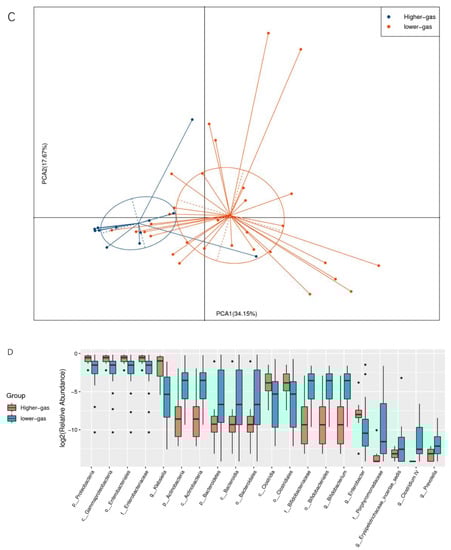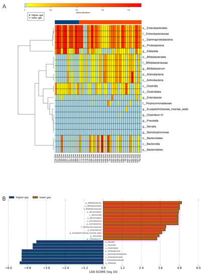The original fecal bacteria of infants were divided into high- and low-gas-producing groups according to the in vitro culture gas production of fecal bacteria in infants fed differently. 16S rRNA sequencing results were combined with those of differences in genera between the two groups (heat map, boxplot, LEfSe, and PC analyses). These results showed that the high-gas-producing group of infant fecal bacteria was enriched with Enterobacteriaceae and Klebsiella, whereas the low-gas-producing group was enriched with Bifidobacterium and Bacteroidetes (Figure 4).