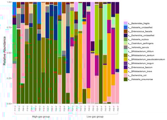 Neonatal abdominal distension or infantile abdominal distension is one of the most common and difficult symptoms to manage in clinical practice []. Neonatal abdominal distension is primarily gas distension and can be caused by various reasons, such as improper feeding, indigestion, abdominal infection, perforation, and necrotizing enterocolitis in newborns. The severity of abdominal distension and accompanying symptoms vary by cause. Although the physiopathology is mixed, dysbiosis caused by infection and antibiotic use is the leading cause of abdominal distension in neonates [,]. The recent discovery of Clostridium neonatale, the causative agent of neonatal necrotizing enterocolitis, which produces large amounts of gas after carbohydrate fermentation [], further clarifies the role of infectious factors in abdominal distension in infants []. The structure of the intestinal flora of newborns varies greatly among individuals, and a significant proportion of normal infants do not have a predominantly Bifidobacteria intestinal flora []. Bifidobacteria are one of the very few genera of human intestinal flora that do not produce hydrogen gas [], and the gut gas production of infants with a Bifidobacteria-dominant flora should be relatively low. Infants with other bacteria dominating their intestines are hypothesized to more likely suffer from gas production and abdominal distension.