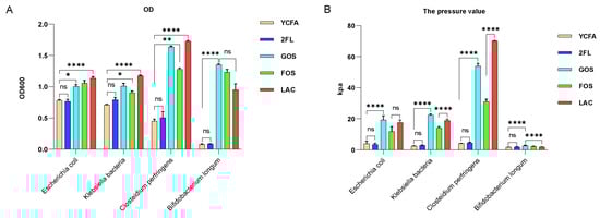 Effect of different carbon sources on the proliferation (A) and gas production of different bacteria (B). Both bacterial proliferation (OD value) and the pressure value were expressed as the mean ± SEM. Differences are considered significant at p < 0.05 (*), p < 0.01 (**) and p < 0.0001 (****).