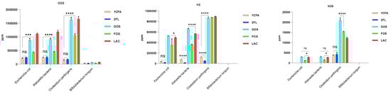 Analysis of the types of in vitro fermentation gases produced by different bacterial strains. The production of CO2, H2, and H2S were expressed as the mean ± SEM. Differences are considered significant at p < 0.05 (*), p < 0.001 (***), and p < 0.0001 (****).