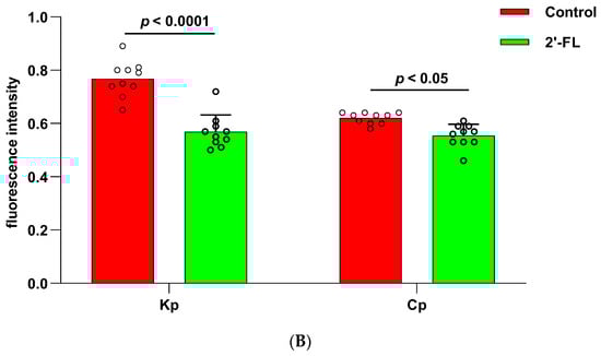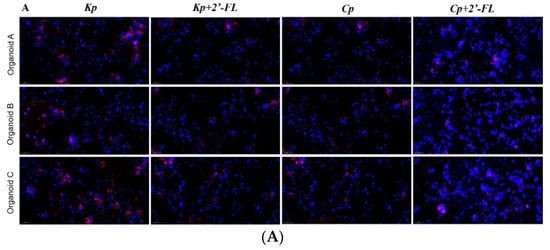 In vitro cultures of K. pneumoniae and C. perfringens, infecting human colonic epithelial organoids, were used, and the results showed that adding 2′-FL to the medium significantly (p < 0.05) reduced the adhesion of K. pneumonia (p < 0.0001) and C. perfringens (p < 0.05) to the intestinal epithelial layer, respectively (Figure 8).