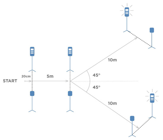 Four pairs of electronic timing gates systems (Fusion Smart Speed PRO, Brisbane, Australia) were set, as pointed out in Figure 1. Participants began each trial 20 cm in front of the starting line. After the first 5 m run at maximum speed in a straight line toward the second timing gate, the system indicates the further direction of the subject’s movement. After crossing the middle gate, the next gate lights turned on, forcing the participant to change direction as quickly as possible while maintaining the maximum possible speed run for the last 10 m. Participants performed two trials. They completed a left or right run in random order after running the first 5 m. The better time from these two trials was used for analysis. The test 1-1-2 scheme is shown in Figure 1.