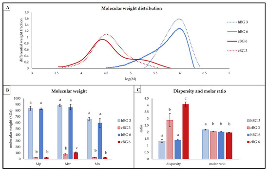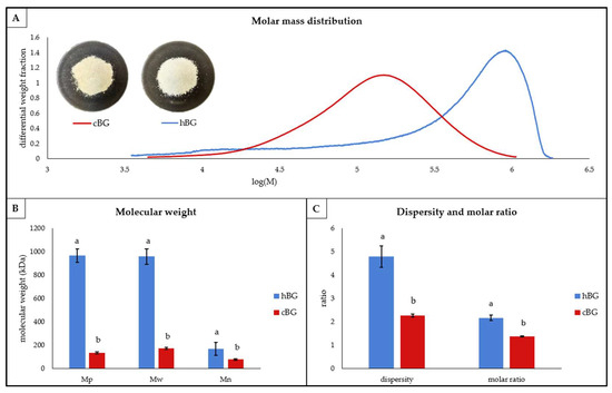 Structural characteristics of high molar mass and control β-glucan (hBG and cBG) presented as: (A) molar mass distribution shown as differential weight fraction plotted against the logarithmic molar mass (M), the pictures represent the cBG and hBG extracts; (B) peak- (Mp), weight average- (Mw) and number average (Mn) molar mass; (C) dispersity and molar ratio. All values are shown as mean ± standard deviation (n = 3, p < 0.05). Different lower-case letters indicate a significant difference between the extracts for each characteristic.