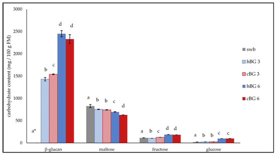 Contents of relevant carbohydrates in standard wheat bread (swb) and in breads fortified with 3% of high molar mass β-glucan (BG) or control BG (hBG 3 or cBG 3) and 6% of high molar mass BG or control BG (hBG 6 or cBG 6 in mg/100 g fresh matter (FM). All values are shown as mean ± standard deviation (n = 3, p < 0.05). Different lower-case letters indicate a significant difference between the breads regarding each carbohydrate. * BG content was below the limit of quantification of 0.25% and hence, set as “zero”.