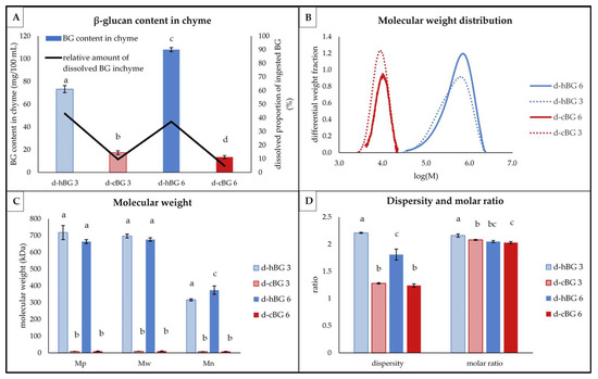 Structural characteristics of β-glucan (BG) present in digested breads breads fortified with 3% of high molar mass BG or control BG (d-hBG 3 or d-cBG 3) and 6% of high molar mass BG or control BG (d-hBG 6 or d-cBG 6) presented as: (A) BG content (bars) and proportion ingested BG, which got dissolved in the chyme; (B) molar mass distribution shown as differential weight fraction plotted against the logarithmic molar mass (M); (C) peak- (Mp), weight average- (Mw) and number average (Mn) molar mass; (D) dispersity and molar ratio. All values are shown as mean ± standard deviation (n = 3, p < 0.05). Different lower-case letters indicate a significant difference between the breads for each characteristic.