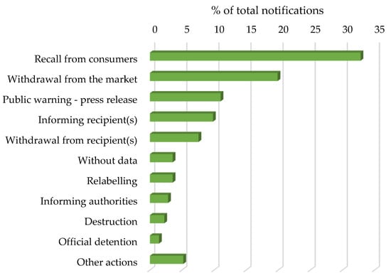 In terms of responses to the notifications, the most frequently taken actions were the foods being recalled from the consumers (38.2%) and withdrawn from the market (19.9%) (Figure 1). All of these results are very relevant since they imply that the food products that contained the undeclared allergens were already on the market and could have already been consumed by an allergic person.