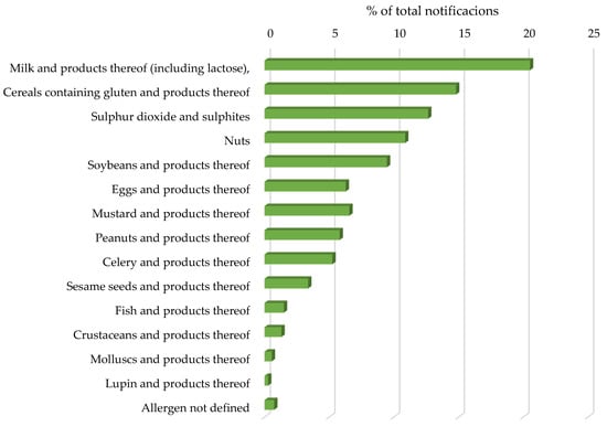 The mandatory indication of allergenic compounds on labels is a very useful tool for patients to avoid consuming foods that contain allergens in their formulations. However, despite being mandatory, food mislabeling is on the rise and does not always adequately contain information about the allergens present [], which implies a risk for allergic patients. Since the presence of undeclared allergens in food labeling has been considered to be a public health risk for a certain population, they have been included in the RASFF system []. The RASFF system database was created by the European Commission to keep the latest information on food recalls and public health warnings in all European Union (EU) countries, as well as Norway, Liechtenstein, Iceland, and Switzerland.