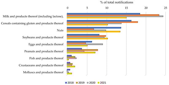 Between 1 January 2018 and 31 December 2021, a total of 844 food-allergen-related notifications were made by the RASFF system, the year 2019 being the one with the highest number of notifications, n = 241, while the years 2018, 2020, and 2021 had n = 207, n = 197, and n = 199, respectively. It should be remarked that, in the period studied, 79.7% of the notifications were classified as an “alert”, which implies that the food presents a serious risk on the market, requiring a rapid action generally aimed at withdrawing the product from the market. However, “information for attention and for follow-up” notifications represented only 17.4%. These types of notifications concern information that does not require a rapid action because the food product containing the undeclared allergen is still not on the market at the time of the report, or the risk is mostly considered low.