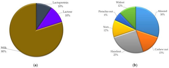 In children, the foods that frequently trigger allergic reactions include eggs, cow’s milk, peanuts, tree nuts, soy, and wheat. Although some allergies typically resolve during childhood, allergies to peanuts and tree nuts, as well as those to fish and shellfish, remain into adulthood []. In children and adolescents <18 years of age, a systematic review that included 42 studies published in Europe between 2000 and 2012 reported a higher prevalence of food-challenge-defined allergies to cow’s milk, 0.6% (0.5–0.8), followed by tree nuts, 0.5% (0.08–0.8), soy, 0.3% (0.1–0.4), eggs, 0.2% (0.2–0.3), peanuts, 0.2% (0.2–0.3), wheat, 0.1% (0.01–0.2), fish, 0.1% (0.02–0.2), and shellfish, 0.1% (0.06–0.3) although these percentages tended to be higher when allergy data were self-reported [].