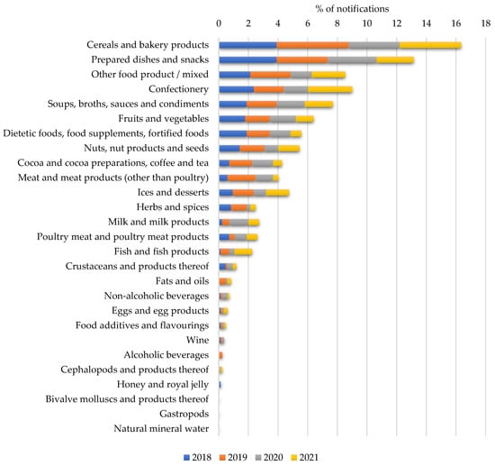 The following are available online at https://www.mdpi.com/article/10.3390/nu14081571/s1. Table S1: Food products included per food category in the RASFF notifications from 2018 to 2021.