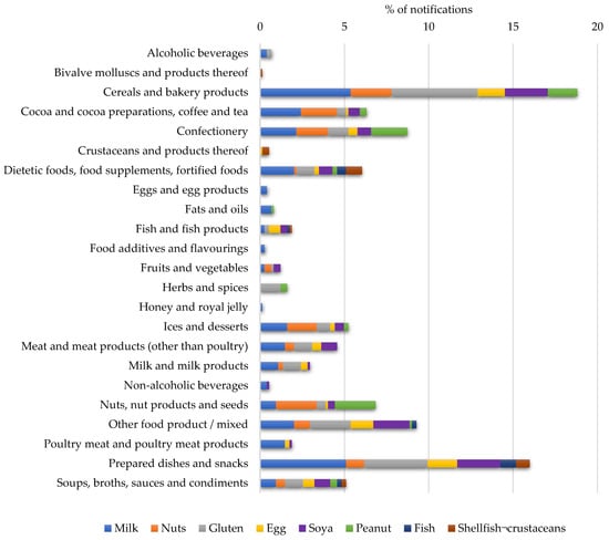 The notification percentage of each food category per year is shown in Figure 6. The results show that the main categories subject to notifications related to undeclared allergens were those of cereals and bakery products (16.3%), prepared dishes and snacks (13.1%), and confectionery (9.0%), followed by others that were classified as mixed products (e.g., frozen veggie burgers) (8.5%) and soups, broths, and sauces/condiments (7.7%). In general, those categories that include food products with a higher degree of processing and number of ingredients proved to be the ones that collected the highest number of notifications. The specific foods included in each category, according to what is stated in the RASFF database, are presented in the Supplementary Material (Table S1).