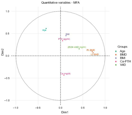 Correlations between quantitative variables and dimensions. The plot depicts the topographical influence in the arrangement of the variables on the graph along the abscissa (Dim1) and the ordinate (Dim2). Thus, we evaluated the weight of the single variables through crossed linear regressions, representing them two-dimensionally on a Cartesian plane. Therefore, the variables, indicated as vectors, according to the position in the represented circle, influence the spatial position of the individuals and consequently their clustering into groups. Abbreviation: BMD = Bone Mineral Density, FN = Femoral Neck, LS = Lumbar Spine.
