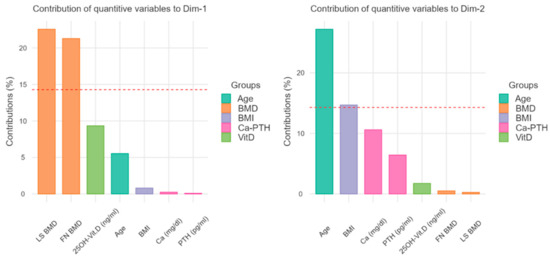 Contribution to the dimensions 1 and 2 (Cartesian axes). With the bar graphs, the plot contribution represents the weight of the single variables on the representativeness of the abscissa axis (Dimension 1) and of the ordinates (Dimension 2). As regards the horizontal axis of the previous figure, the greatest influence is attributed to the BMD values, while the vertical axis is related to the age and the BMI values. BMD = Bone Mineral Density, FN = Femoral Neck, LS = Lumbar Spine.